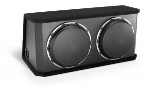 Two 12W6v2-D4, sealed enclosure, rear-firing, black vinyl/carpet finish, 4 Ω final impedance, steel mesh grilles included.